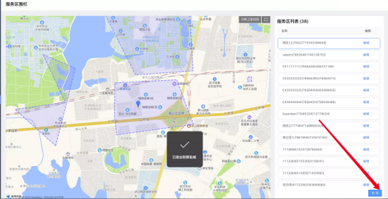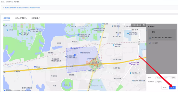 3、补充新增片区必填字段后,在服务区范围内绘制片区,点击完成即可完成绘制;